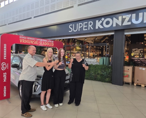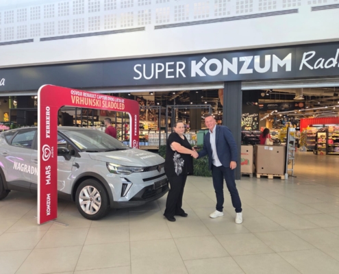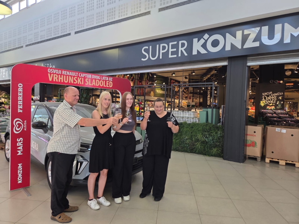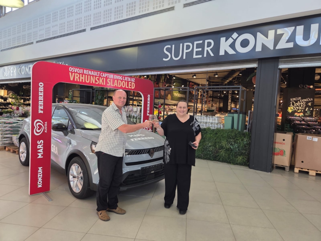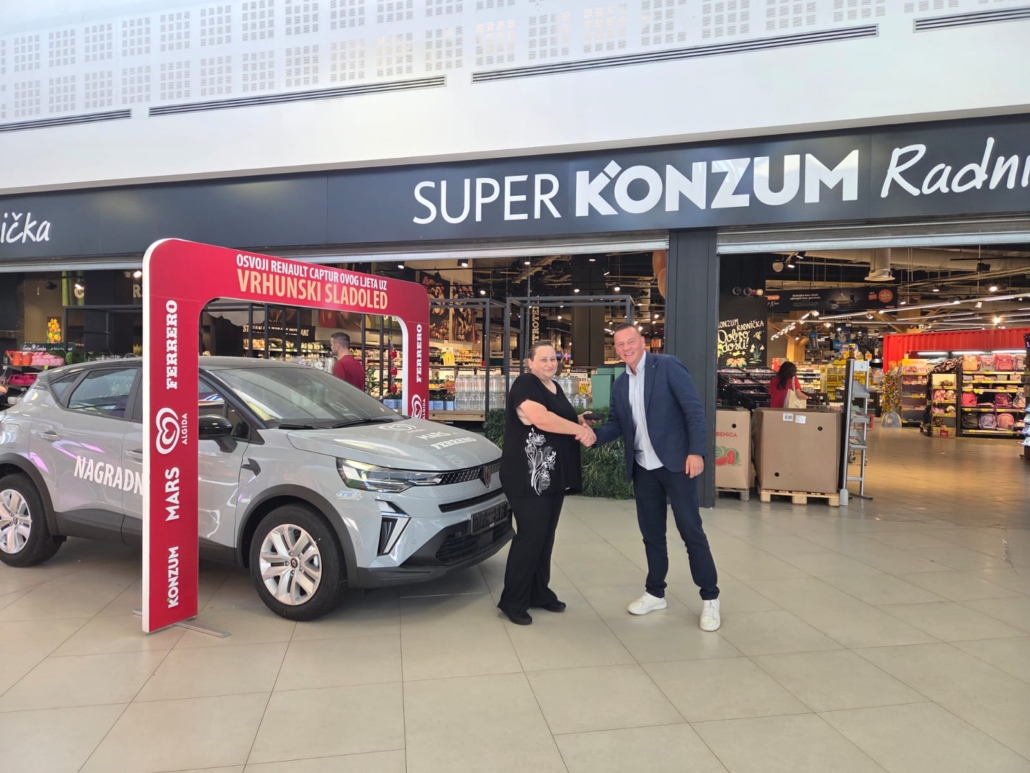 Sretnoj dobitnici gospođi Svjetlani iz Virovitice svečano je uručen automobil Renault Captur Evolution TCe 90, model 2025. Nagradu je osvojila sudjelovanjem u nagradnoj igri Algida-Ferrero-Mars, koja se odvijala u odabranim Konzum prodavaonicama.